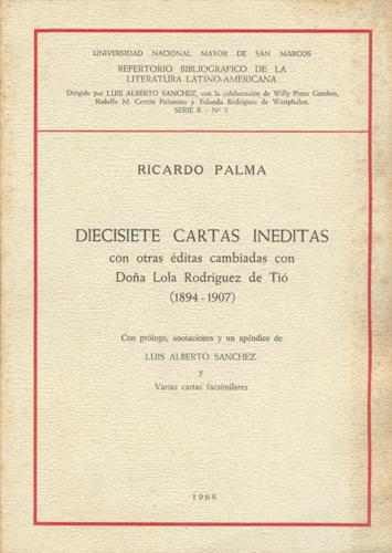 | Palma, Ricardo, 1833-1919. Diecisiete cartas inéditas con otras éditas cambiadas con Doña Lola RodrÃguez de Tió (1894-1907) . --Lima: Universidad Nacional Mayor de San Marcos: 1968. : Serie B, 3)# Ingreso:2-0000016108 92 p. : facsim. .; 24 cm..
